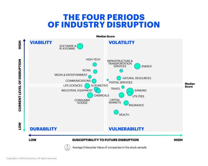 Dans cette étude, Accenture a développé un« indice de vulnérabilité à la disruption » en identifiant 15 facteurs qui caractérisent ce processus de transformation d’un marché. Les chercheurs ont pris en compte la présence d’acteurs « disrupteurs », la performance financière, l’efficacité opérationnelle, l’engagement en matière d’innovation et les capacités de rebond des entreprises.